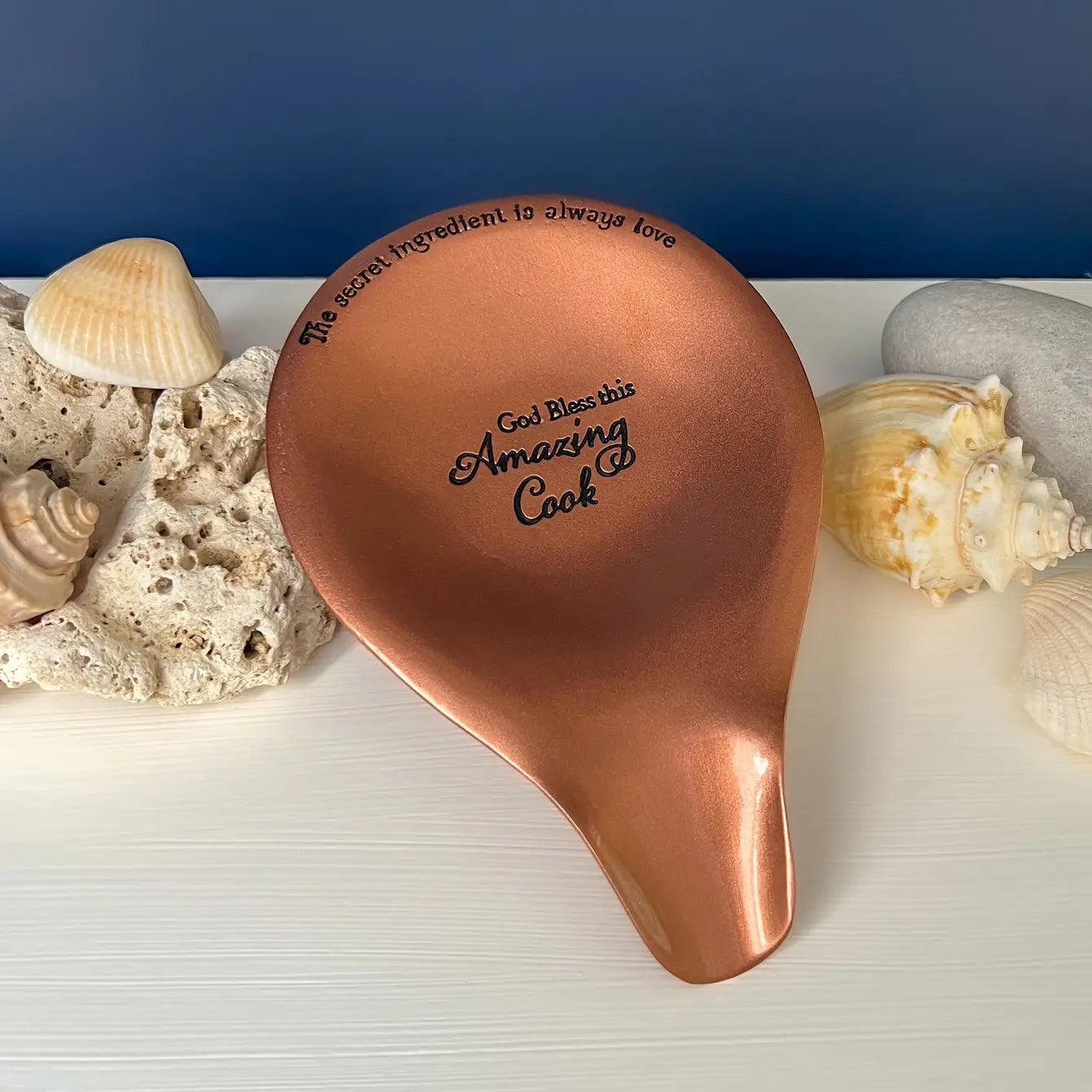 Oversized spoon rest in enamel finish. Features blackened type in center “God bless this amazing cook", and “The secret ingredient is always love” on the top edge. Dishwasher safe.