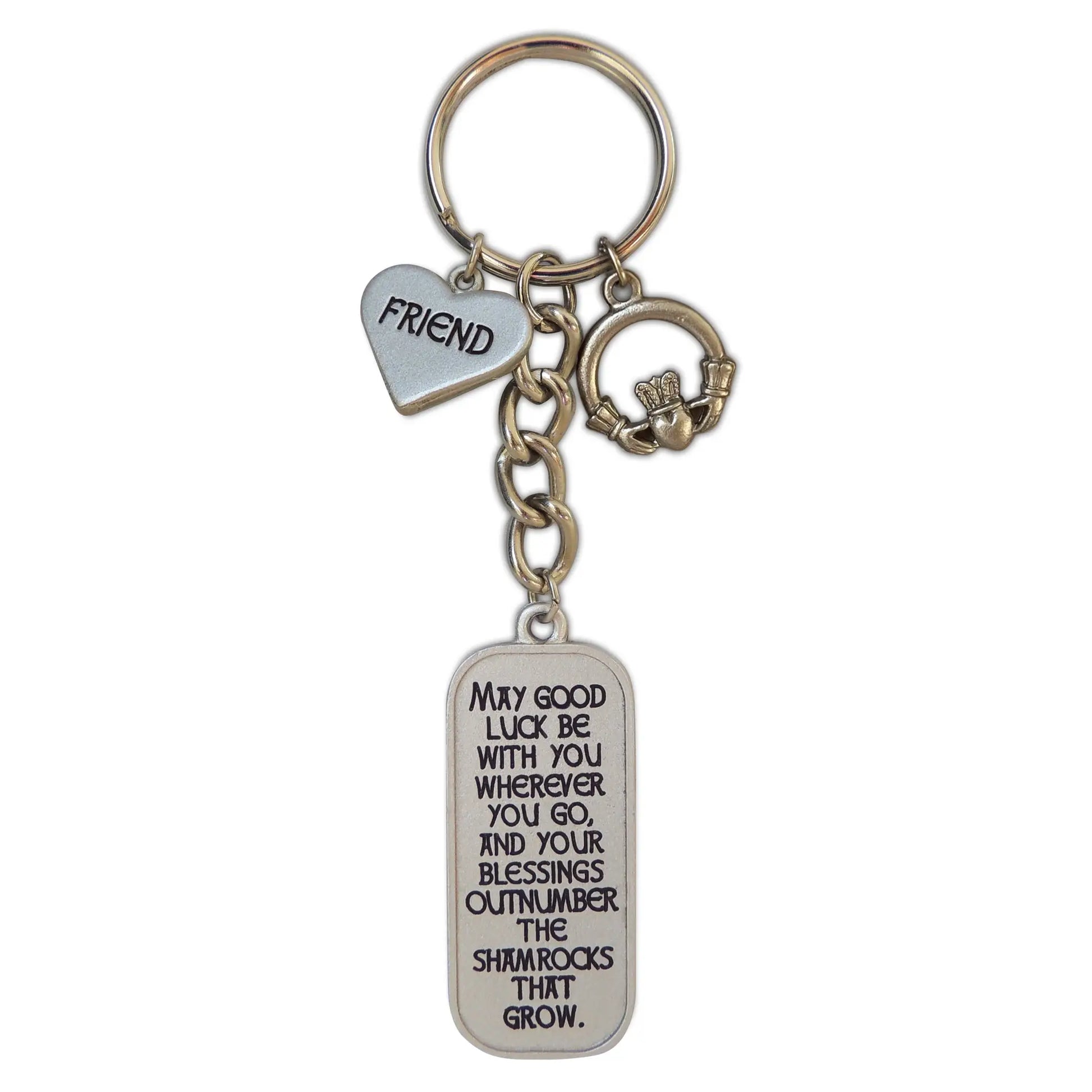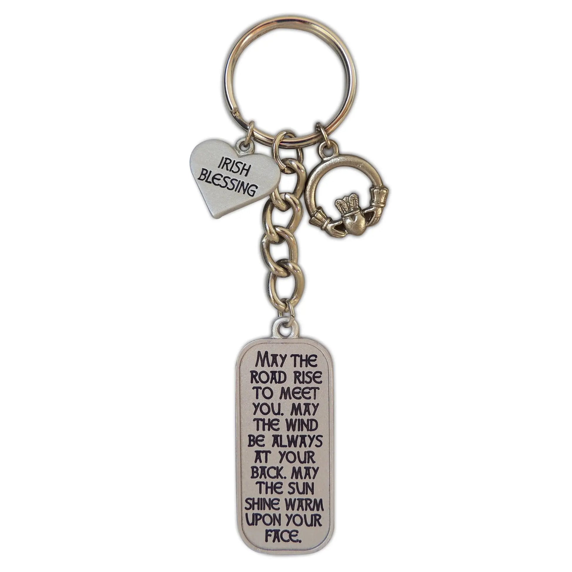 Gemstone heart key rings. Each tag features a travel blessing with a sparkling crystal heart and cast metal cross charm, all finished in silver enamel. 1 ⅛” x 4 ⅜” overall length.