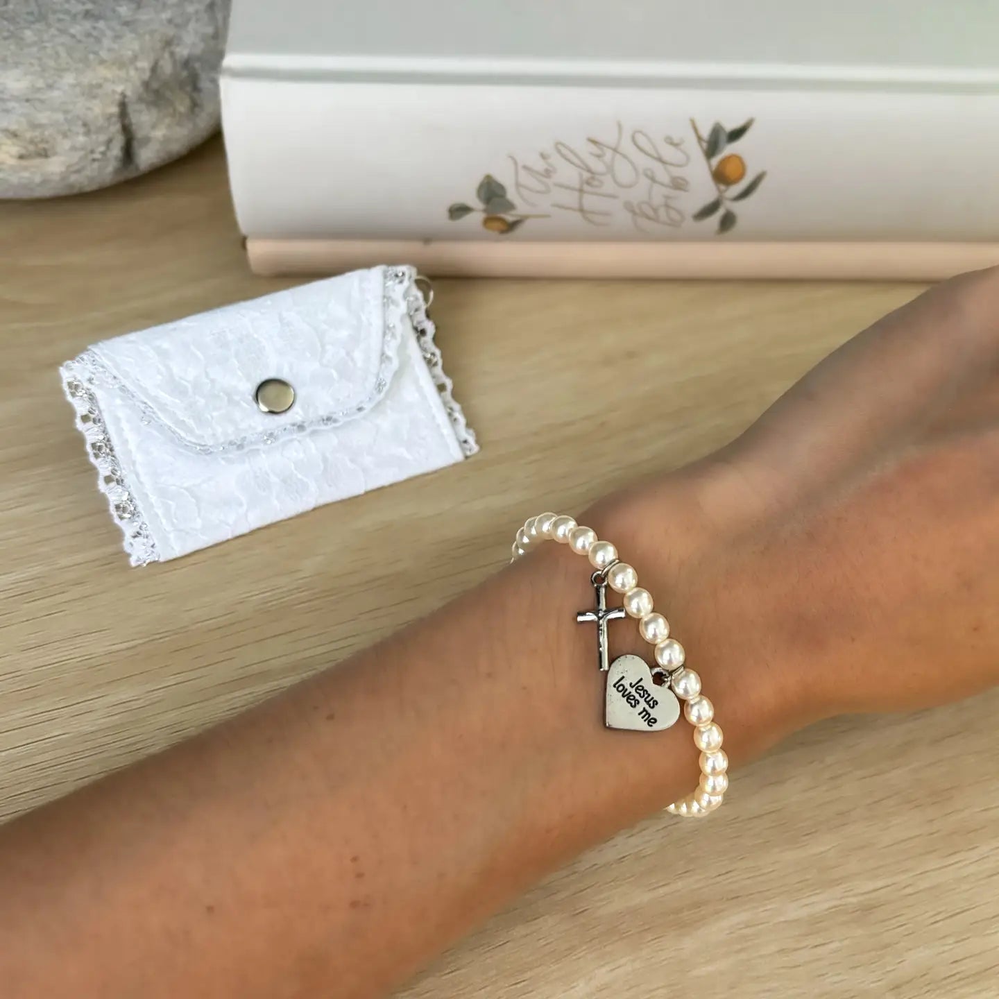 Fabric purse with lace trim and metal snap closure, complete with stretch bead charm bracelet. Purse size is 3 ½”W x 2”H.