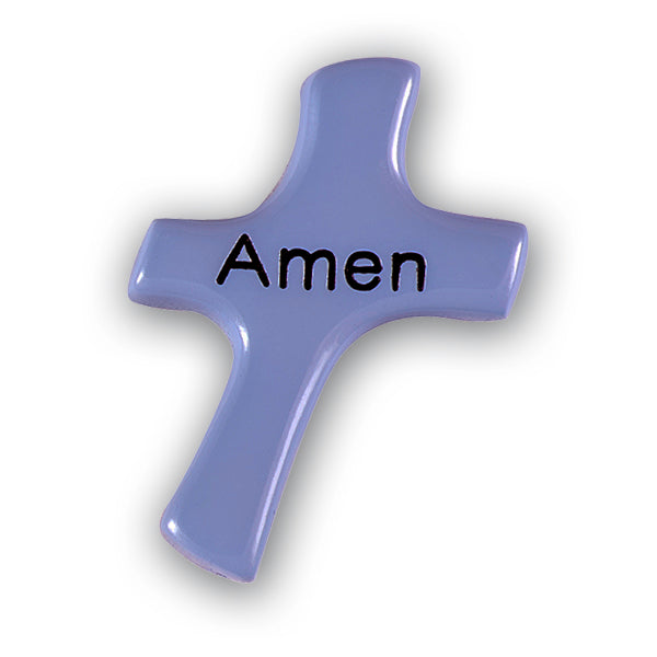 Cast metal pocket crosses in colored enamel finishes featuring etched words of inspirational, a reminder of God in your heart, to keep with you at all times. 1 ½”.