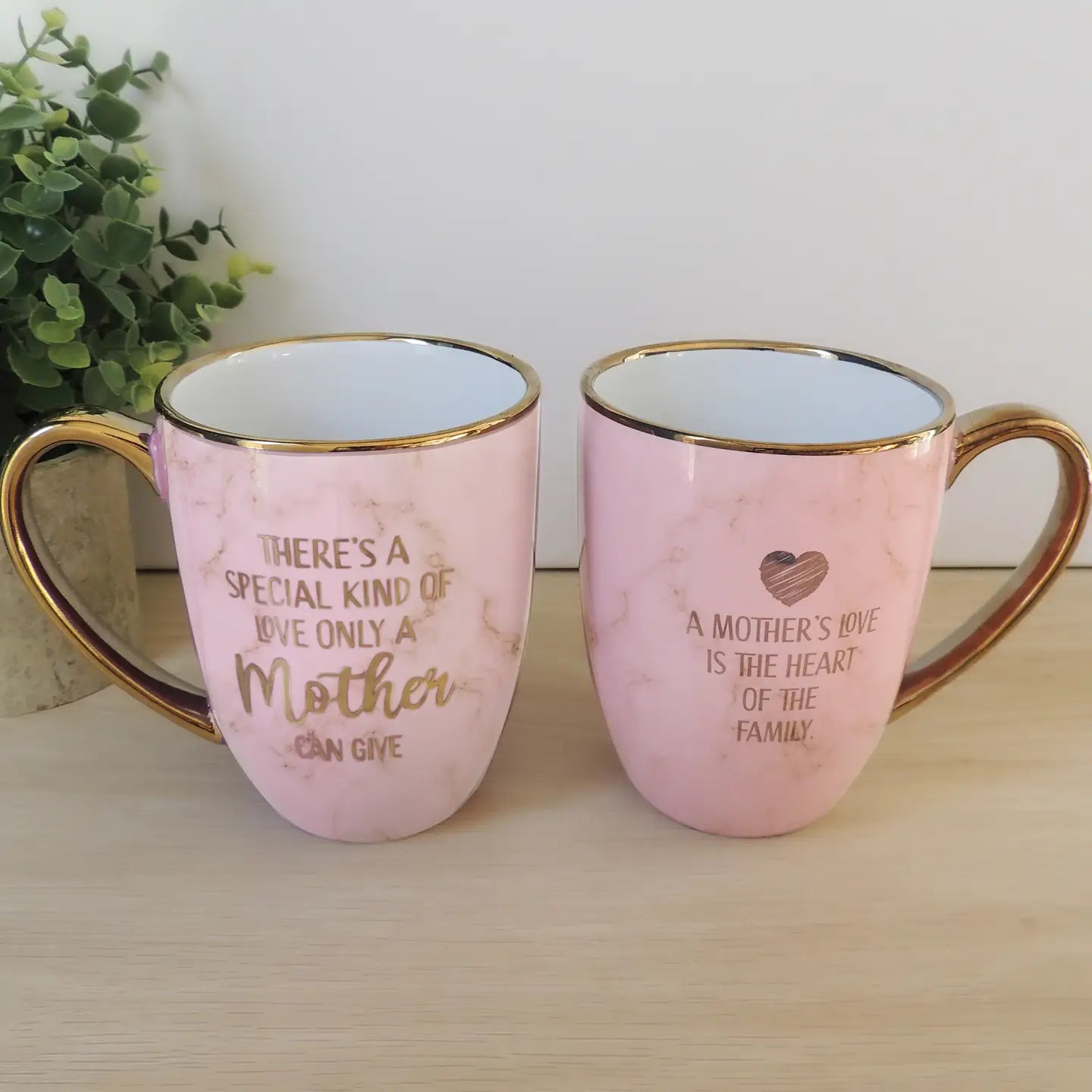 Mugs for special women in your life featuring Inspirational messages of faith. Pastel marbleized finishes accented with gold handle and rim. Not microwave safe. Hand wash only. Do not microwave. 4 ½” H x 3 ½” D. 18 oz. capacity.