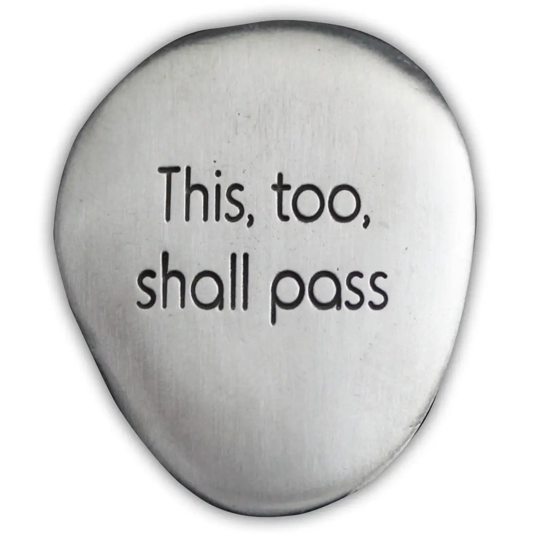 Silver enamel finish soothing stones with inspirational messages on one side and smooth back for relaxation and anxiety relief. Approximately 1 ½”.