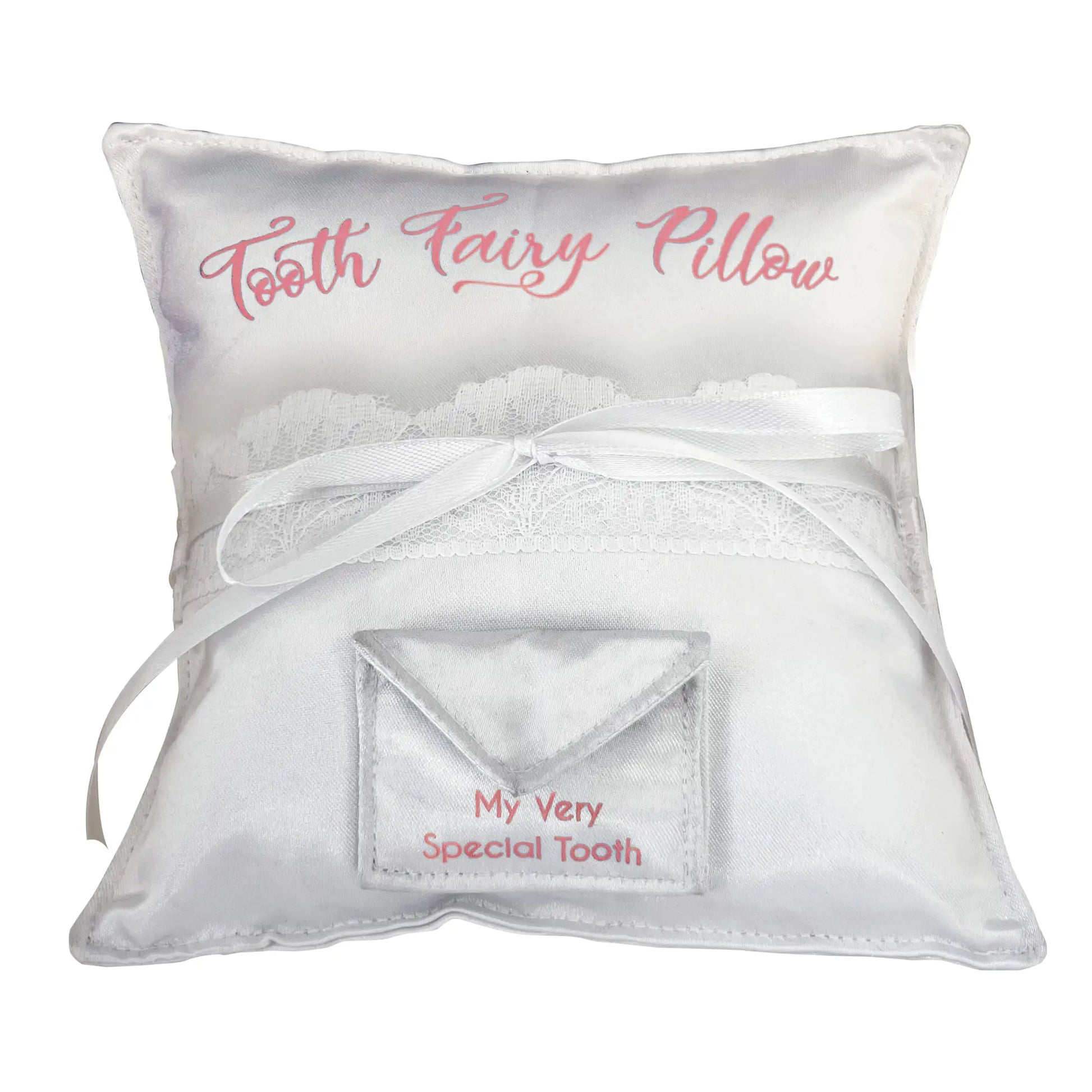 Tooth Fairy Pillow. Silk screened fabric with lace, ribbon and pocket with velcro closure. 6” x 6”. Window boxed. Comes in blue or pink writing.